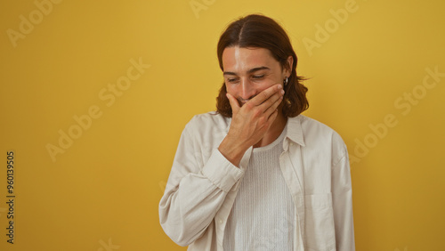 Handsome, young, hispanic, man with long hair in casual attire against a vibrant yellow wall, covering his mouth with a hand from laughter.