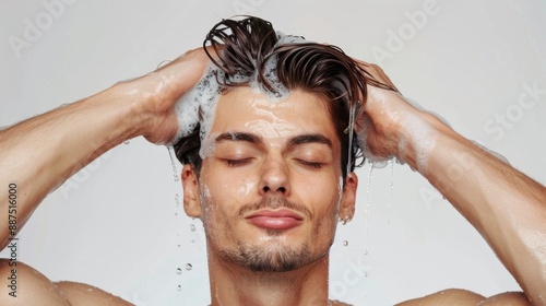 man, massaging, washing, head, hair, shampoo, arm, calm, ethnicity, expression, eye, facial, guy, human, joy, palm, skin, tranquil, wet, clear, focused, person, routine, care, caucasian, closed, isolated, morning, portrait, white, young, 1, adult, clean, european, hand, healthy, water, background, beautiful, brown, fresh, applies, photogenic, scalp