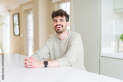 Handsome young man smiling cheerful at the camera with a big smile on face showing teeth