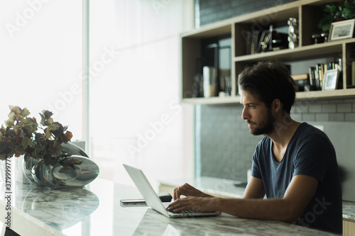 male, laptop, portrait, man, luxury, lifestyle, kitchen, home, photogenic, furniture, desk, cool, computer, caucasian, casual attire, beautiful, beard, bar, home, alone, copy space, young, working, work, using, typing, 20s, technology, table, stylish, space, single, shelf, white, person, people, adult, adult, 20s, young adult, young adult, young person, grown-up