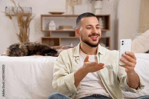 Handsome young man with mobile phone and cute cat on bed in bedroom