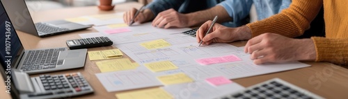 Hands-on financial session with founders marking up a paper financial model beside laptops and calculators
