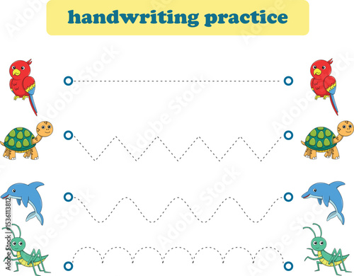 Handwriting Practice. Tracing lines for kids with animals. Vector Illustration