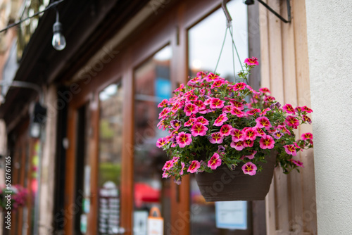 Hanging Flower Pot Filled with Pink Flowers during Spring Outside a Restaurant in Greenwich Village of New York City