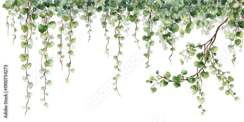 hanging, greenery, foliage, cascading, plant, vine, ivy, leaf, branch, nature, floral, botanical, decorative, ornamental, pattern, texture, watercolor, illustration, art, design, green, white, brown, stem, delicate, organic, natural, lush, vibrant, soft, detailed, background, border, wall, decor