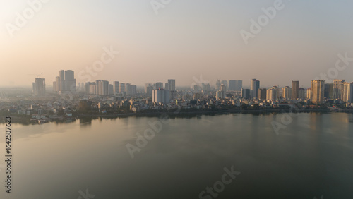 aerial, building, calm, city landscape, dusk, hanoi, highrise, lake, panorama, scenic, skyline, sunset, tranquil, travel, urban, vietnam, water