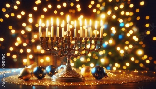 Hanukkah menorah illuminated on festive blurred background
