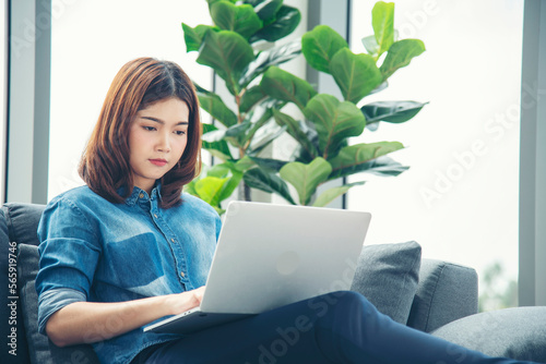 Happiness Asian Woman working from home using laptop online meeting in home office. Happy relax time asian business woman typing keyboard use notebook laptop Smiling, laughing at home office.