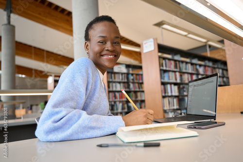 Happy African Black girl student using laptop computer in university library sitting at desk hybrid learning online, doing college course study or research, writing notes, elearning. Portrait.