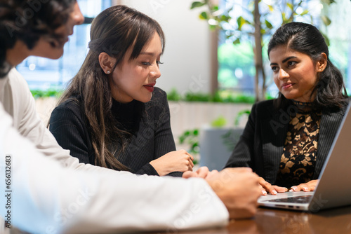 Happy Asian couple consultation about marriage, life insurance, and buying a new house plan. An Indian insurance sale broker give them about financial and investment advise.