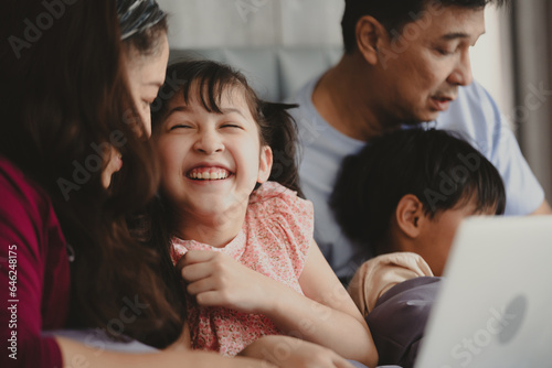 Happy Asian family lying on bed in bedroom with smile, father and mother with daughter and son, lovely parents using laptop computer for education and spent quality time together, laughing together