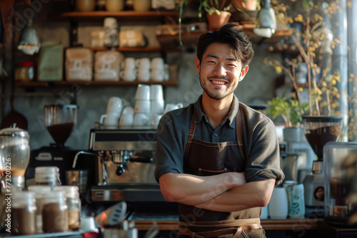happy, male, cafes, owner, arm, folded, asian, hot drink, shop, counter, entrepreneur, apron, joyful, bustling, business, professional, service, hospitality, adult, young, man, smiling, workplace, barista, satisfaction, friendly, welcoming, confident, small, skilled, career, work, lifestyle, urban, craftsman, hand-made, independence, leadership, job, occupation, contentment, men at work, relaxed, portrait, arms crossed, entrance