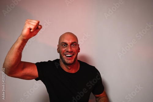 Happy bald man celebrating success with a raised fist. Positive energy and achievement.