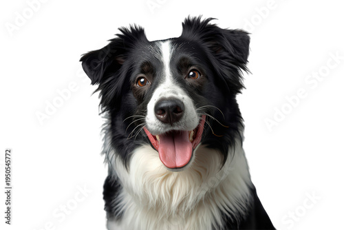 Happy border collie breed looking at camera, smiling, sticking tongue out, transparent background, pet portrait concept