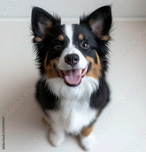 border collie, dog, happy, pet, animal, sitting, playful, fur, cute, companion, black, white, tan, smiling, domestic, breed, canino, portrait, cheerful, fluffy, joyful, friendly, adorable, expressive, young, well-groomed, studio, closeup, looking, attentive, loyal, vibrant, nature, love, happiness, family, fun, social, intelligent, energetic, affectionate, light background