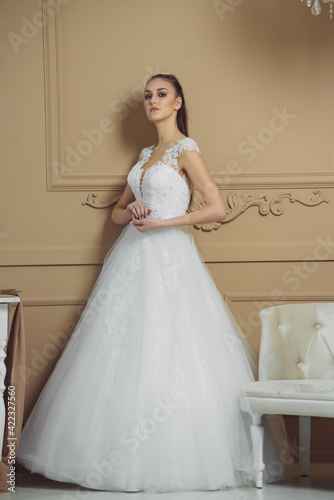 Happy bride in luxury sparkly wedding dress posing in studio on brown background. Marriage concept.