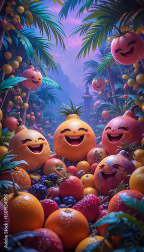 fruit, cartoon, happy, tropical, cute, fantasy, paradise, fun, colourful, pineapple, orange, nature, animation, jungle, exotic, vibrant, joyful, berry, banana, laughing, sweet, juicy, palm tree, surreal, animated, happiness, storytelling, adorable, celebration