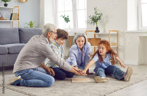 Happy cheerful senior family of grandmother, grandfather and grandchildren putting hands in a stack finishing collecting puzzle in living room at home. Grandparents playing with kids.
