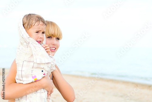 happy child with young mom on the sea