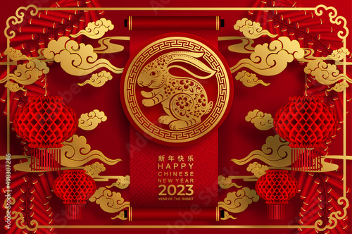 Happy chinese new year 2023 year of the rabbit zodiac sign with flower,lantern,asian elements gold paper cut style on color Background. (Translation : Happy new year)