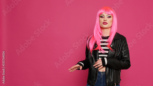 portrait, studio, wave, conference, video, call, teleconference, webcam, remote, talk, chat, beauty, glamour, fashion, make-up, beautiful, elegant, pretty, cute, stylish, sexy, carefree, natural, leather, jacket, rocker, style, trendy, punk, fun, cosmetic, skin, pink, lip, eye, face, hair, wig, happy, joyful, smile, woman, model, adult, person, caucasian, young, background