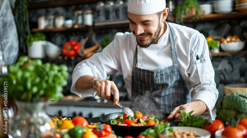 chef, cooking, kitchen, food, eatery, professional, happy, cook, cookery, culinary, apron, meal, dinner, preparation, plating, dish, epicure, tasty, delicious, fresh, smile, stove, ingredient, chopping, modern, hospitality, service, men at work, uniform, expert, kitchen utensile, knife, vegetable, receipe, steam, frying, meat, dinnerware, heat, teamwork, occupation, catering, workspace, confident, stainless, employee, menu