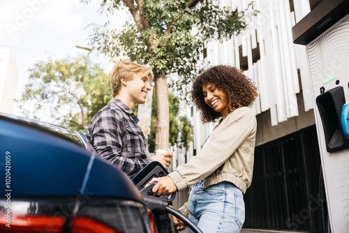 Happy couple charging their electric car at an outdoor station. Urban lifestyle and eco-friendly transportation. Engaging in sustainable living together.