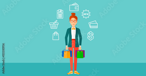 caucasian, flat, design, vector, illustration, cartoon, person, people, human, character, background, market, purchase, client, shop, buy, hold, buyer, layout, around, consumerism, store, consumer, shopping, concept, signs, carrying, holding, pack, money, cash, basket, icon, credit, card, eat, bag, cardboard box, bargain, package, carry, dollar, happy, smiling, blue, girl, lady, woman, female, horizontal