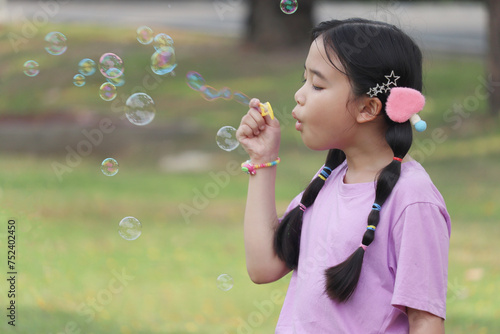 Happy cute Asian girl with pigtails blowing soap bubbles in green nature garden. Kid spending time outdoor in meadow. Cute child having fun with bubble in summer park.