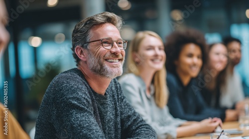 business meeting, collaboration, teamwork, brainstorming, discussion, professional, colleague, cooperation, success, achievement, workplace, office, confident, optimistic, inclusion, diversity, equity, goggles, man, woman, people, group, light, bright, warm colors, friendly, corporate culture, leadership, communication, connection, engagement, strategy, planning, innovation, growth