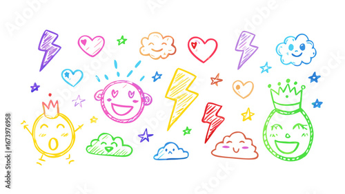 doodle, illustration, character, symbol, heart, cloud, lightning, star, colourful, playful, cute, whimsical, hand-drawn, graphic, design element, icon, cartoon, cheerful, happy, vibrant, creative, isolated, cut-out