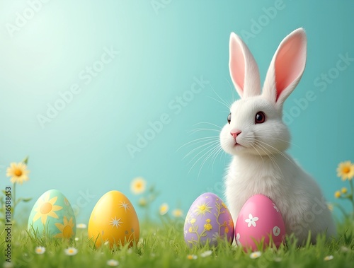 Happy Easter greeting with Easter eggs and bunny in flowers and grass green field. Horizontal poster, greeting card, header for website