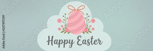 easter, happy, egg, ribbon, flower, spring, holiday, celebration, pink, orange, red, green, grey, handwritten, script, floral, bow, cloud, background, light, dotted, arrangement, festive, greeting, card, nobody, still life, object