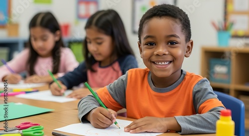 children, student, school, classroom, education, learning, drawing, crayons, table, happy, boy, elementary, children, smiling, studying, children, grade, primary, class, writing, activity, art, desk, indoor, supply, paper, african, american, ethnicity, young, cute, pupil, cognition, creativity, lesson, childhood, kindergarten, preschool, intelligence, academic, design, project, colourful, cheerful, positive, friendship, together, teamwork