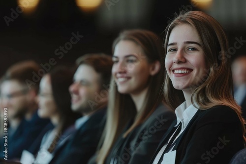 Happy entrepreneurs communicating while attending business seminar in conference hall.
