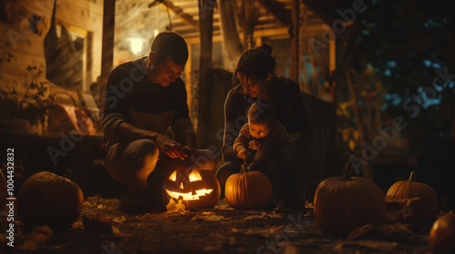 Happy family carving pumpkin for Halloween together. Heartwarming picture of family having fun making Jack o lantern for holidays in autumn.