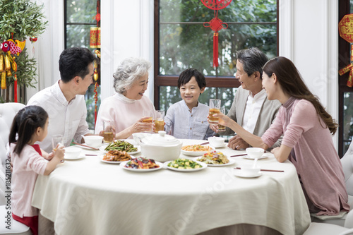 family, man, woman, boy, girl, asian, chinese, mid, senior, adult, children, father, mother, grandparent, grandchild, son, daughter, smile, food, happiness, chinese new year, togetherness, celebration, lifestyle, dinner, 6, group, indoor, day, people, lunar, new year
