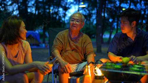 Happy family of grandfather senior taking together, Cooking grilled barbeque dinner outside beach, enjoy summer on the beach enjoy on weekend people lifestyle.
