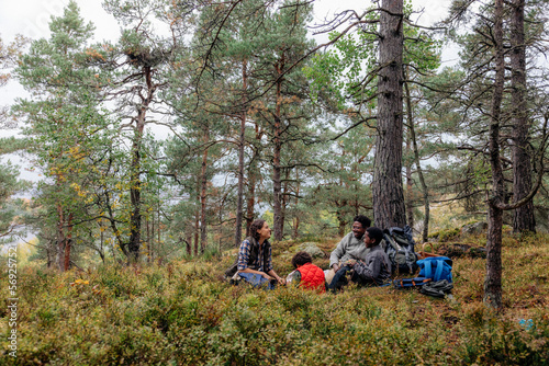 african ethnicity, biracial, day, europa, family, photo, recreational pursuit, four people, color image, togetherness, delight, horizontal, healthy lifestyle, autumn, communication, lifestyle, happiness, mother, nature, father, boy, travel, enjoyment, vacation, scandinavia, forest, timberland, son, sweden, tree, exploration, outdoors