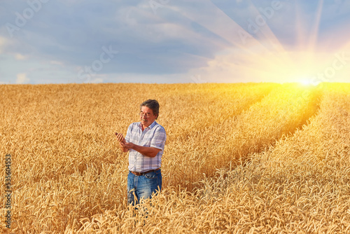 wheat, farmland, crop, harvesting, farmer, field, cereal, harvest, agronomist, looking, crossed, chest, corporate, arm, cultivated, rich, camera, standing, senior, agriculture, rural, proud, organic, farm, farming, 1, man, male, ripe, success, racked, wheatfield, tractor, portrait, business, countryside, nourishment, working, mixed, plant, land, agrarian, work, country, agricultural, harvester, men at work, bearded, grain