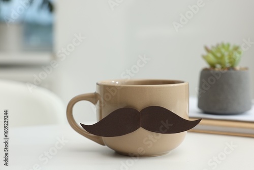 Happy Father's Day. Cup with paper moustache and books on white table indoors, closeup