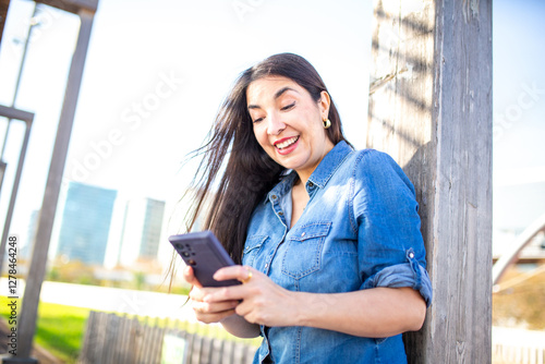 woman, phone, smartphone, using, browsing, happy, urban, park, background, copy space, female, middle-aged, denim, shirt, long, hair, mobile, looking, screen, sunny, day, spring, autumn, latin, hispanic, casual attire, natural, expression, lifestyle, light, texting, chatting, networking, message, reading, outfit, portrait, wooden, post, building, outdoors, shadow, dark, mature, 50s, mobile phone, technology, communication