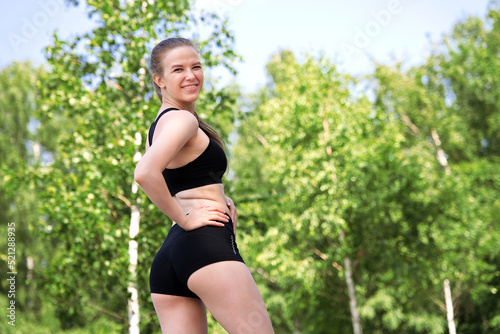 happy fit fitness athletic girl runner running, jogging, young beautiful woman is smiling training outdoors at summer sunny day in the morning in black top and shirts looking at camera