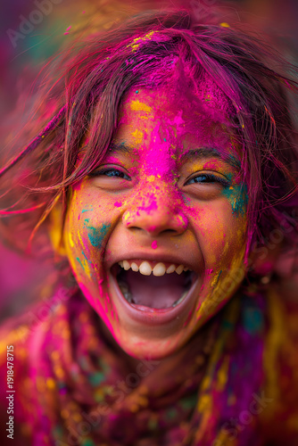 Happy girl celebrating Holi festival with colorful powder, joyful child laughing during traditional Indian celebration of colors