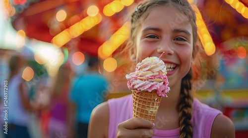 girl, children, children, ice cream, cone, summer, festival, fair, amusement park, carnival, happy, smiling, fun, celebration, food, treat, delicious, sweet, dessert, joy, outdoors, bokeh, blurred, background, light, colourful, bright, cheerful, carefree, family, friendship, laughter, enjoyment, vacation, memory, childhood, innocence, summer day