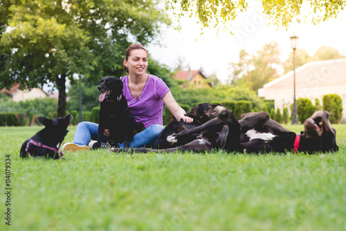 happy girl siting and enjoying with her dogs in park,underexposed photo