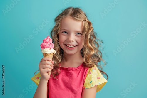 happy child, girl, ice cream cone, joy, sweet, dessert, smiling, playful, enjoyment, delicious, colourful, vibrant, treat, cheerful, childhood, indulgence, happiness, youth, carefree, vivid colors, tasty, fun, candid, curly hair, pleasure, sunny day