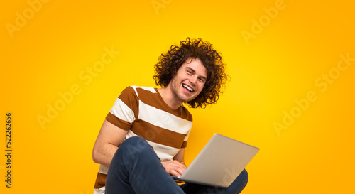 man, using, laptop, student, smile, cheerful, online, typing, remote, freelance, cyberspace, happy, lesson, male, young, curly hair, dark hair, study, connection, glad, content, education, positive, browsing, casual attire, guy, communicate, learn, joy, digital, toothy smile, optimist, delight, project, self employed, work, cognition, research, assignment, studio shot, isolated, yellow background, copy space, horizontal