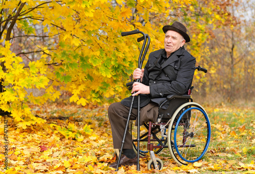 autumn, challenge, crutch, depressed, despair, despondent, disability, disabled, elderly, fall, hand, hat, head, health, leaf, leg, loneliness, lonely, male, man, mobility, old age, overcoat, pensioner, person, retired, retirement, sad, season, senior, sitting, tree, unhappy, wheelchair, wood, worried, yellow