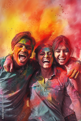 happy hindu indian people celebrate holi festival by throwing colorful powder at each other, generative AI